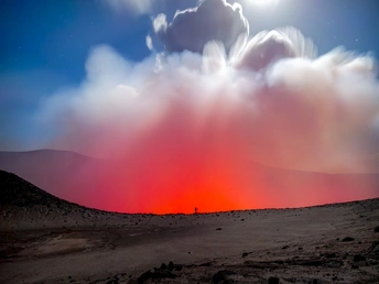 凌晨四点,我独自攀上瓦努阿图亚苏尔火山口。此刻正值满月,冷冽的月光洒落大地,与火山口喷涌而出的炽热红光交织在一起。天空的云被月色照亮,犹如天幕缓缓拉开,而脚下的岩浆在咆哮,喷射出的热浪把夜空映得通红。 画面自拍的人影显得格外渺小,却也是整幅作品的核心——这是人与自然力量之间的对话。摄影不仅是记录景象,更是一次对尺度的探索:月亮距离我们三十八万公里,岩浆就在脚下翻滚,而人类,正处在这两种极端能量之间。