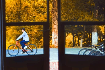 这张照片通过门框的视角,将骑行者和秋日的景色巧妙地融合在一起,形成了一种独特的画面感。金黄色的树叶作为背景,烘托出浓厚的秋日氛围,也使得骑行者的身影更加突出。构图上,利用门框形成天然的画框,增强了画面的层次感和空间感。光线柔和,使得画面整体色彩温暖而舒适。从主题意义上来看,这张照片展现了人与自然的和谐共生,传递了一种积极向上的生活态度。整体而言,这是一张富有创意和艺术感的作品。拍摄者善于利用环境和构图,捕捉到了生活中的美好瞬间,值得鼓励。