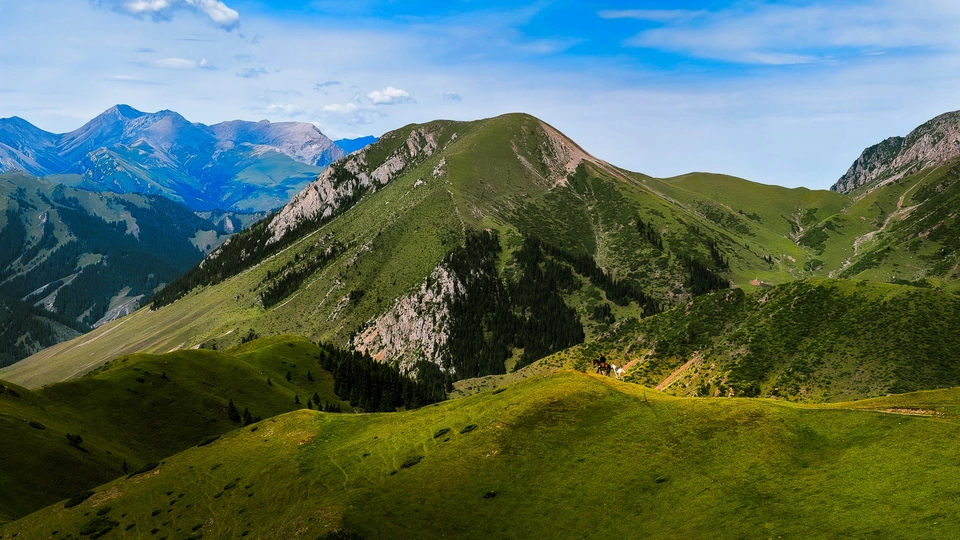 画面中展现了一幅壮美的山间景致。连绵起伏的山峦绿意盎然,深浅不同的绿色交织,仿佛是大自然精心绘制的画卷。近处山坡上,绿草如茵,偶有几棵树木点缀其间。远处的山峰巍峨耸立,岩石裸露的部分与葱郁的植被相映成趣。蓝天白云之下,整个场景给人一种开阔、宁静且充满生机的感觉。