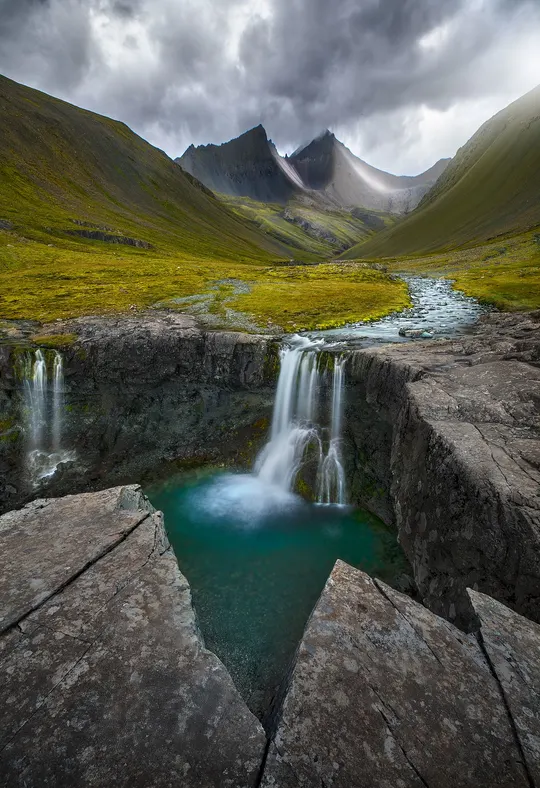 这是冰岛极为小众的一条瀑布,前景的岩石形成奇特尖锐的切角,冰川流水在断崖的尽头坠下,当天的天气一如既往的阴晴不定。