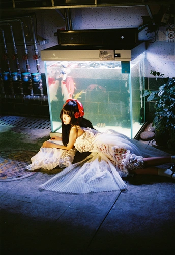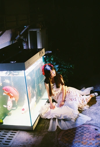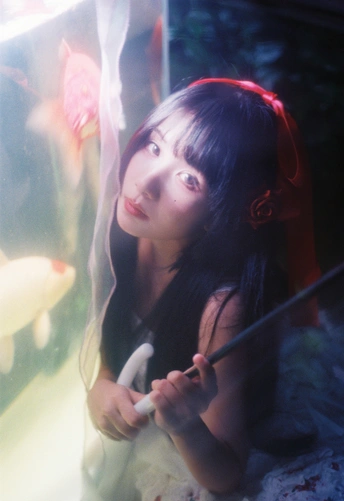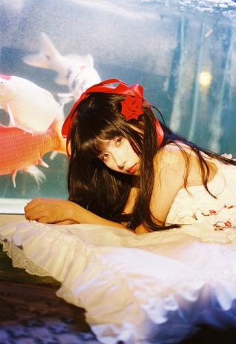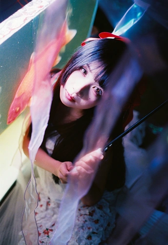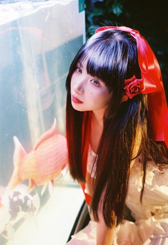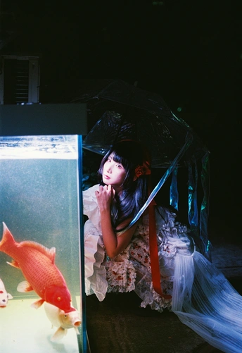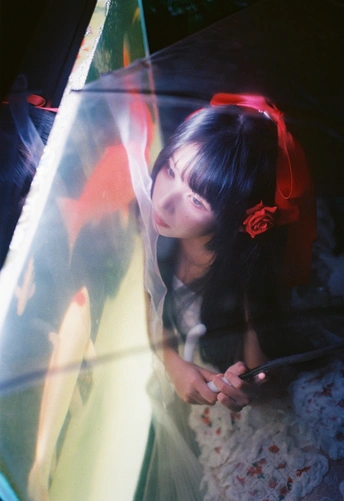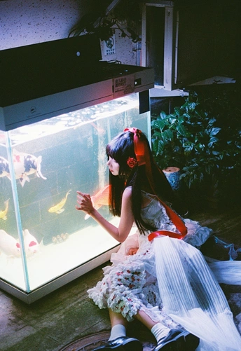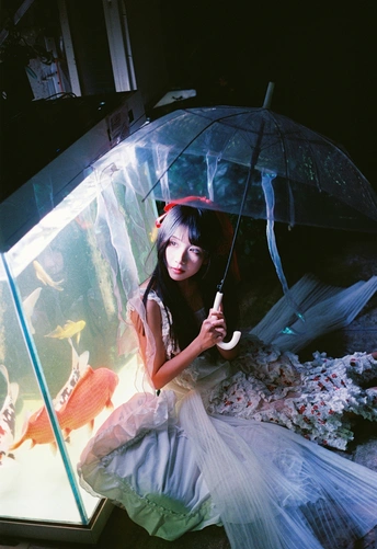 设备:康泰时g1 富士400 有时候觉得,人也该像这样,找个“鱼缸”似的角落待着。外面的喧嚣是一回事,自己心里的小天地是另一回事。透明伞垂着的丝带晃啊晃,把光也切成了细细的丝,缠在她的裙角上。 红锦鲤在水里游得自在,她在伞下也安静得自在。两个“自在”碰在一起,倒让这夜色里的小场景,有了种童话才有的温柔——好像只要愿意,谁都能为自己造一个发光的小世界。