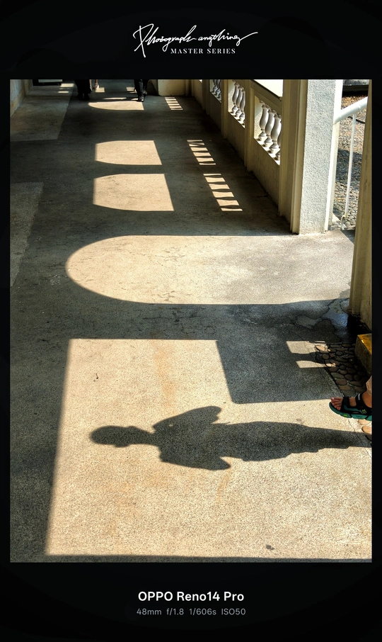 漫步在充满历史感的回廊,阳光透过雕花栏杆,在地面勾勒出几何图案。行人的影子与建筑的轮廓交织,形成一幅动态的光影画卷。 OPPO Reno14 Pro的48mm镜头,以f/1.8的大光圈,将光影层次细腻呈现。1/606s的快门速度定格瞬间,ISO50的低感光度让画面纯净细腻。 每一道光影都是时光的印记,每一次按下快门都是与美好的邂逅。用OPPO Reno14 Pro,记录生活中的艺术时刻✨