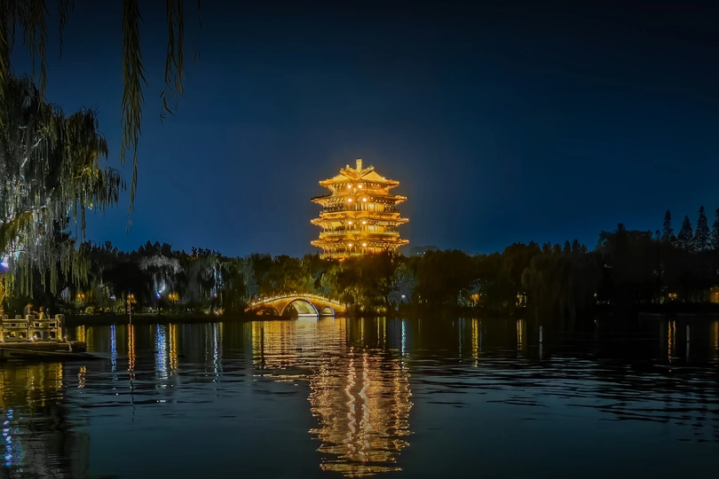 在蓝调时间的大明湖,拍摄了湖对岸的超然楼及湖面的倒影,表现冷暖色对比及超然楼的璀璨。