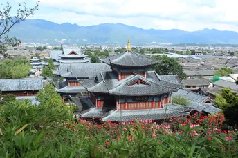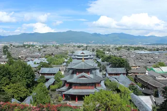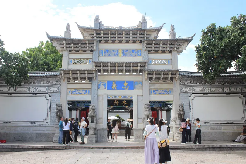 木府,全称木氏土司府衙署,位于云南省丽江市古城区大研街道关义街光院巷49号,地面积30666.66平方米。木府原系丽江世袭土司木氏衙署,“略备于元,盛于明”。明代木得(1382 ~1390年),开建主体建筑。1998年,重建,并在府内设立了古城博物院。木府充分反映了明代中原建筑的风采气质,同时保留了唐宋中原建筑古朴粗犷的流风余韵,府内沟渠纵横,活水长流的布局,又见证了纳西族传统文化的精神所在。木府中轴线全长369米,坐西向东,“迎旭日而得木气”,左有青龙(玉龙山),右有白虎(虎山),背靠玄武(狮子山),东南方向有龟山,蛇山对峙而把守关隘,木府怀抱于古城,沿中轴线依地势建有忠义坊、义门、前议事厅、万卷楼、护法殿、光碧楼、玉音楼、三清殿、配殿、阁楼、戏台、过街楼、家院、走廊、宫驿等15幢,大大小小计162间。衙内挂有几代皇帝钦赐的十一块匾额,上书“忠义”、“诚心报国”、“辑宁边境”等
