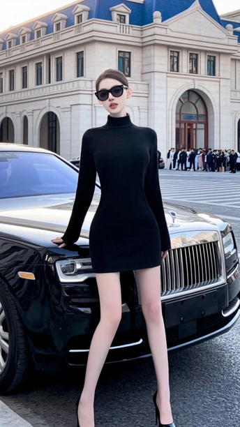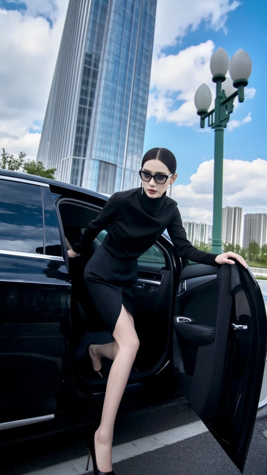 模特身着黑色短裙,搭配高跟鞋与墨镜,从豪华车中优雅下车,气质冷峻而自信,展现出都市女性的时尚与力量感。现代建筑与车辆的背景相得益彰,凸显出黑色服饰的经典与高级。