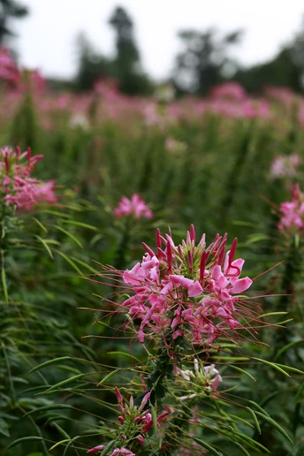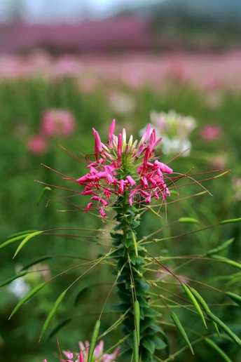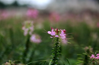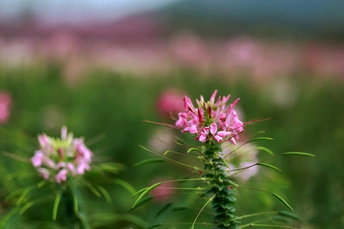 醉蝶花(Tarenaya hassleriana (Chodat) Iltis)是白花菜科醉蝶花属 [6]的一年生粗壮草本植物。株高1-1.5米;掌状复叶;托叶剌状叶柄常有淡黄色皮刺;总状花序顶生,花瓣红、淡红或白色,瓣片倒卵状匙形;雄蕊柄长1-3毫米;雌蕊柄长4-5厘米;果密布网状纹;种子较平滑为褐色;花果期3-8月 [6]。因其花瓣倒卵形,有长爪,似蝴蝶,故叫“醉蝶花”“凤蝶草” [7]。 醉蝶花原产于热带美洲,全球热带至温带栽培以供观赏,在中国各大城市常见栽培。性喜高温,较耐暑热,忌寒冷 [8];喜干燥、温暖的环境;喜阳亦耐半阴;生长适温15-25℃;适宜在疏松、肥沃和排水性佳的土壤中生长。繁殖方式一般为播种繁殖 [9]。 醉蝶花可全草入药,性辛、涩,平;有小毒,有祛风散寒、杀虫止痒之功效 [10],常用于治疗风湿疼痛,湿热疮毒,皮肤痘痒等 [11]。醉蝶花的花瓣轻盈飘逸,盛开时似蝴蝶飞舞,在夏秋季节用于布置花坛,也可进行矮化栽培,作为盆栽观赏。同时,醉蝶花对二氧化硫、氯气的抗性都很强,是非常优良的抗污花卉。其花语和象征意义是:神秘