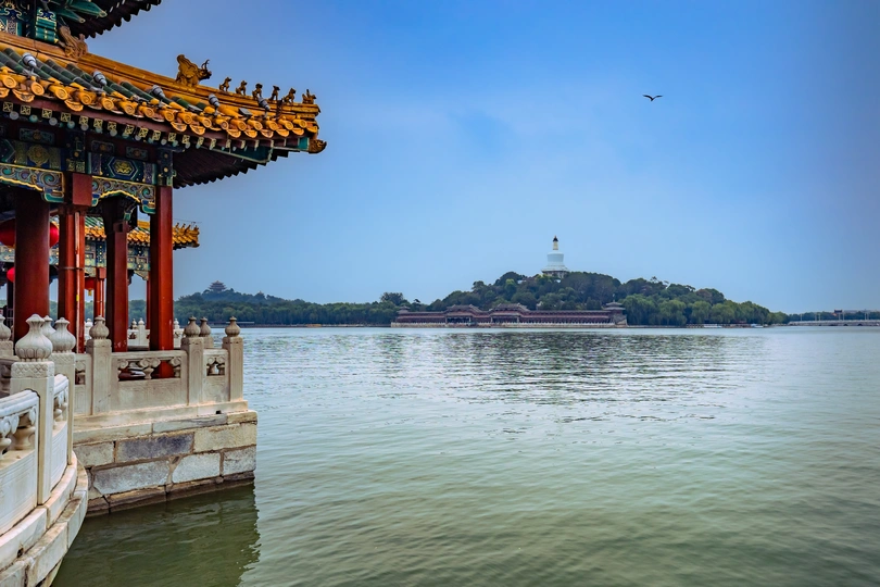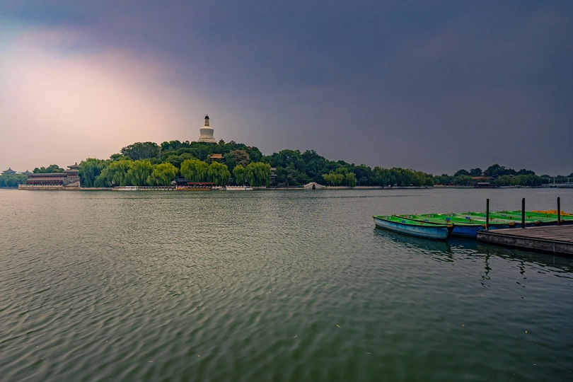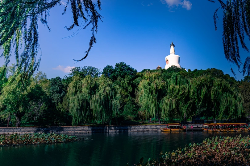 北海公园白塔在湖光林影、亭台水色的映衬下,或清新雅致,或悠远壮丽,尽显其古典神韵与园林灵动之美,展现出北海独特的景观魅力。