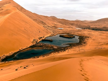 橙金是荒原的底色,而这汪幽蓝是神笔落下的意外:沙浪翻涌千万年,终是捧出了一捧凉。