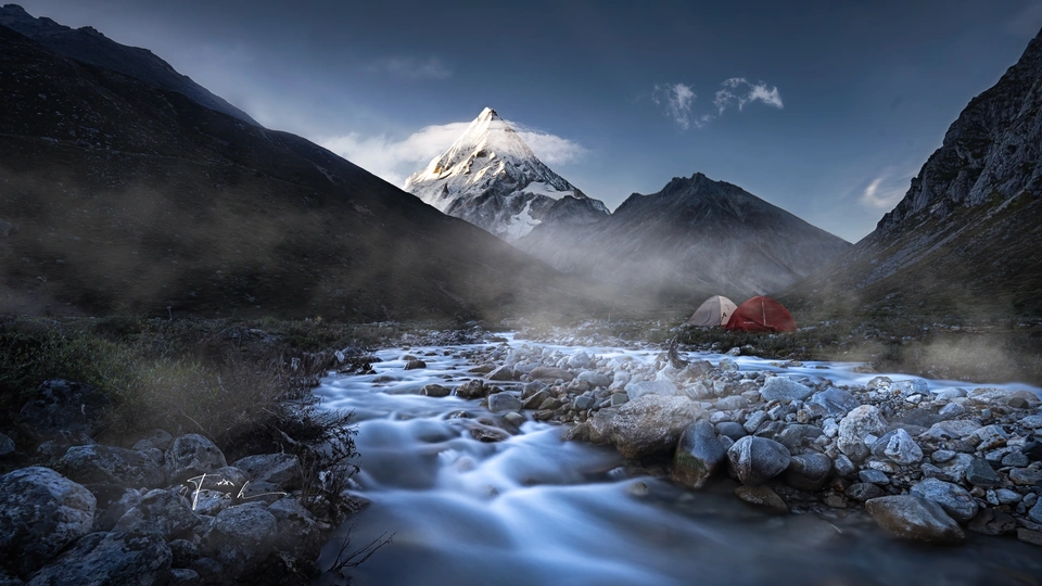 两岔河远望小贡嘎 山谷气候瞬息万变, 前一刻晴空万里,瞬间就云雾笼罩, 近4000海拔往返跑了三次,才等来的一份日照金山。