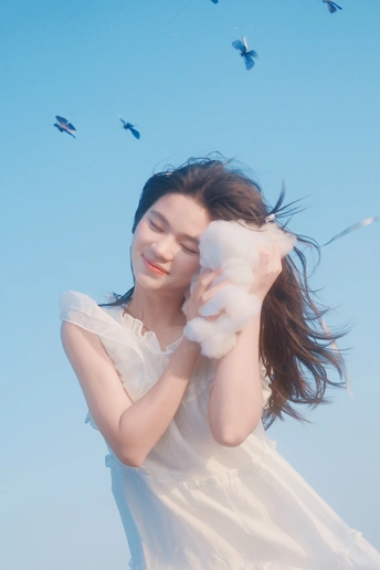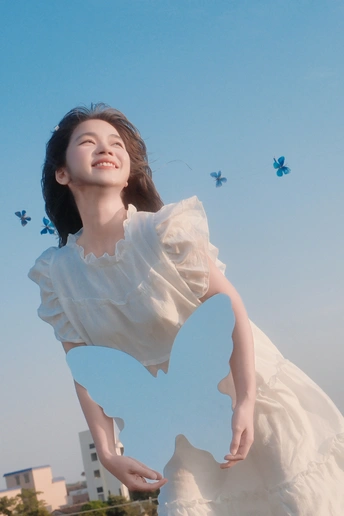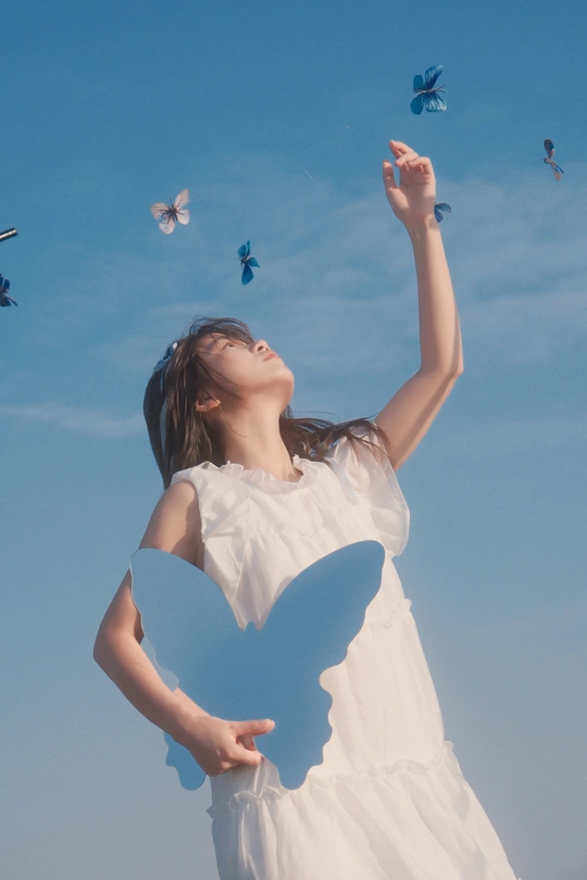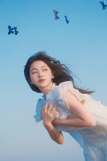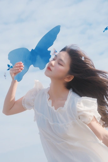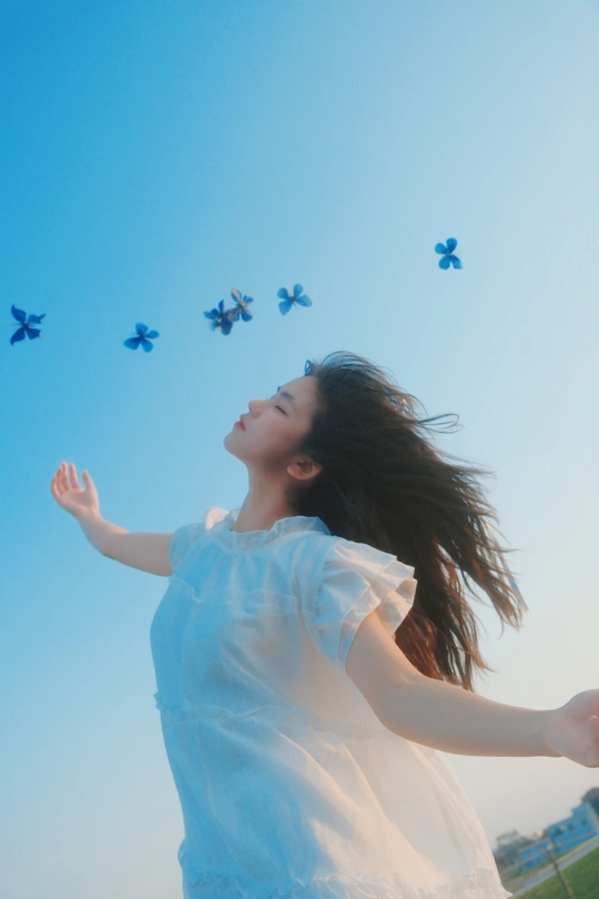 风掀起裙摆时,发梢先接住了蓝天的呼吸。几只钴蓝蝴蝶从云隙间跌下来,吻过她微扬的下颌。白裙是舒展的诗行,手臂向风的来处打开——此刻,青春不必具象,只消这一帧蓝与白的轻舞,就把晴朗攥成了掌心的软风