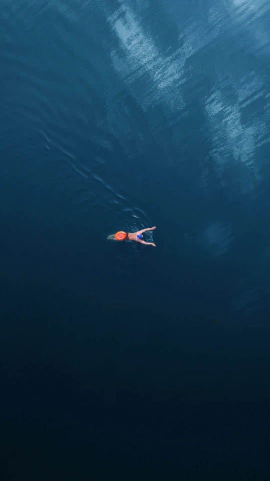 湖水倒映着天空,云朵在湖中泛起白斑,此时一位游泳的人从湖中游过,不需要太多复杂的元素,人水天相互交融,简单而又美好。