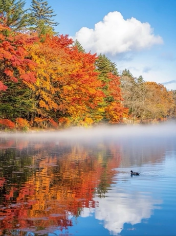 枫叶红透了,秋天真的来了。水面倒映着一片火红,鸭子在水里嘻嘻地游着,溅起一圈圈涟漪。风一吹,叶子轻轻飘落,连空气都带着温柔的凉意。