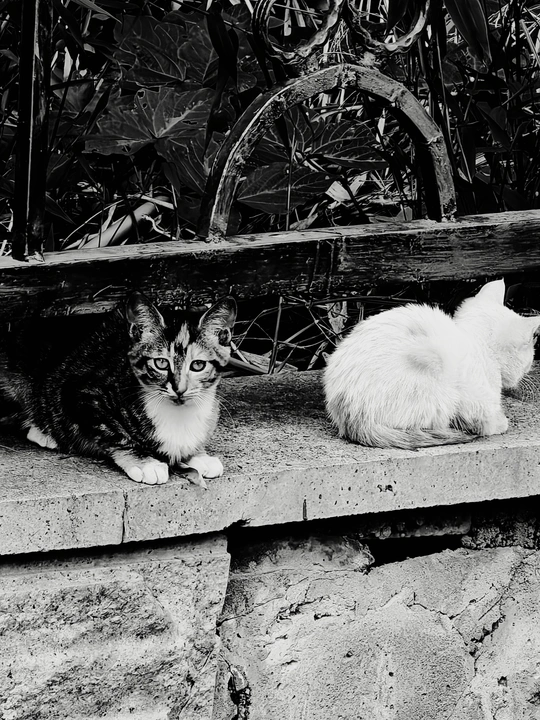 斑猫睁着琉璃似的眼, 看镜头把此刻凝固; 白猫蜷成蓬松的云, 尾巴卷着风的细语。 老石栏驮着它们, 像驮着两个沉默的谜—— 一个望向人间, 一个背对喧嚣, 在这黑白的画里, 各有各的 安静与逍遥。