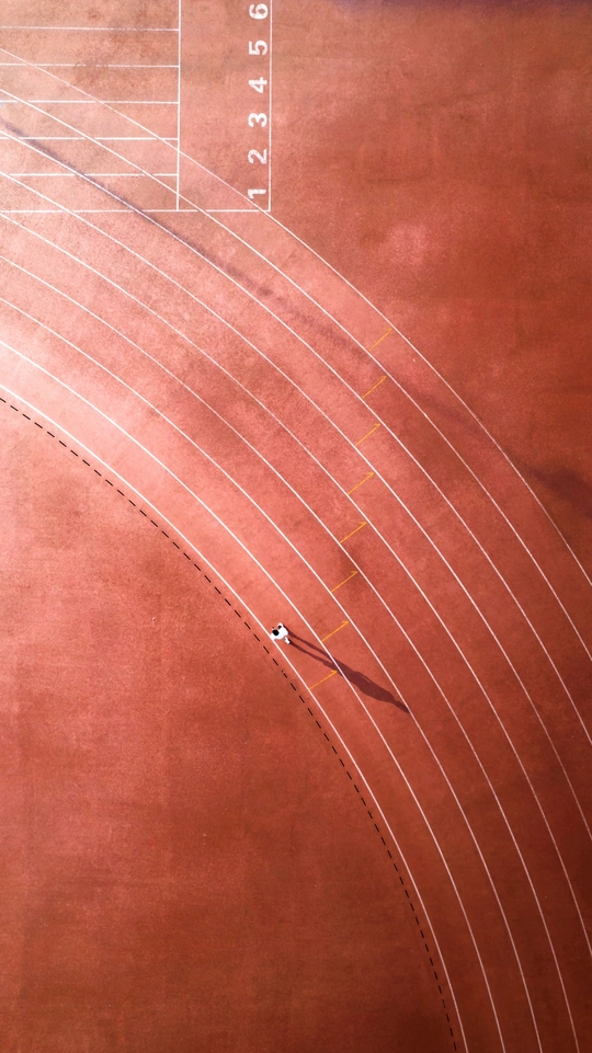阳光下的跑者,跑道组成的线条如同乐谱,那一个影子就像孤独的音符。