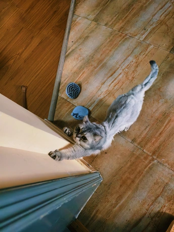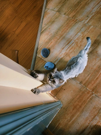 银渐层知道我喜欢它扒门伸懒腰的姿势。每次我睡起来出房门,它就这样伸个懒腰。我每次都会摸摸它的背,然后喂冻干给它。所以我说它的技能点都点在讨吃的上了。