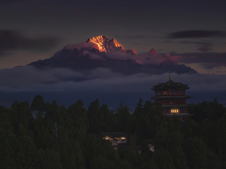 当古城还未苏醒,玉龙雪山已披上第一缕金光。古楼的灯火与破晓的霞光温柔对话,云雾缭绕成诗。这一刻,我独享了千年茶马古道的静谧与浪漫。