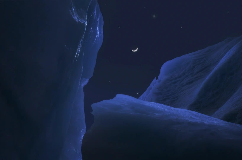 月光如薄纱倾泻,将千年寒冰浸染成通透的蓝宝石。冰纹是时光的刻痕,蜿蜒着地质世纪的密语;一钩新月与零星星尘低垂天际,与冰原共酿一场寂静的狂欢。此刻天地倒转——冰川是跌落的星空,夜空是融化的极冰,唯有风声在耳畔写下永恒的序章。
