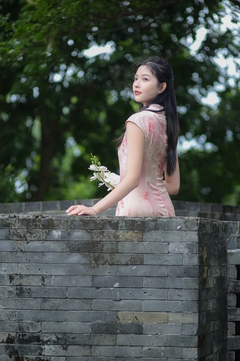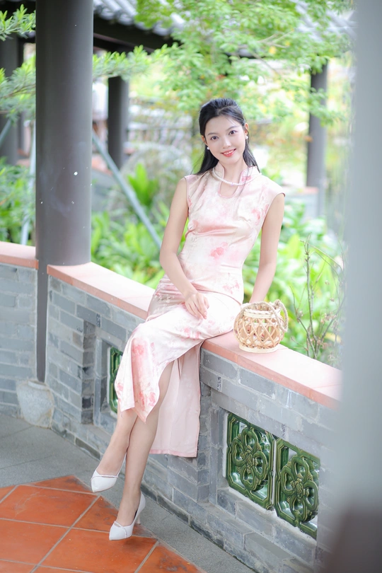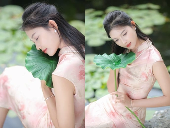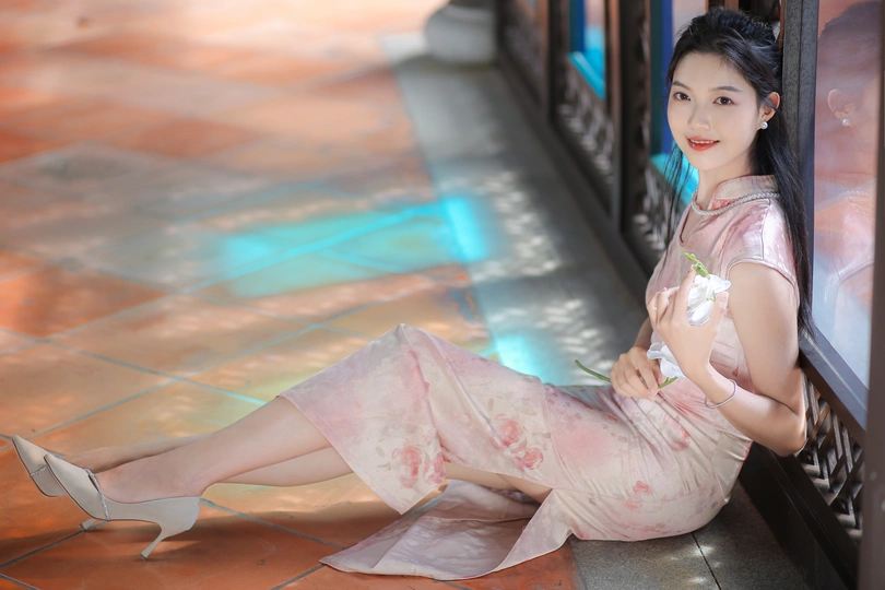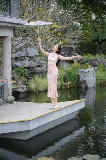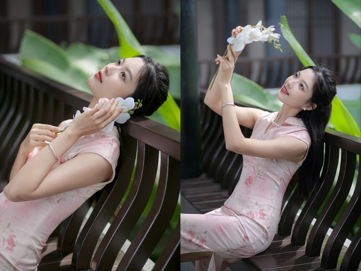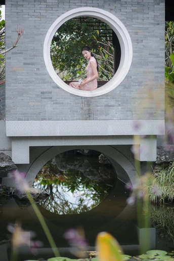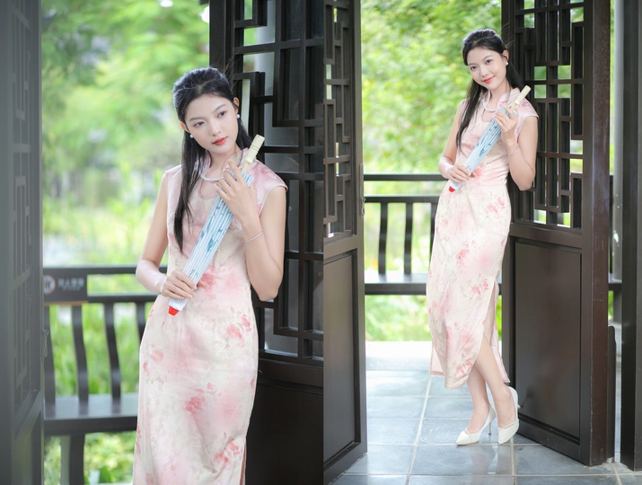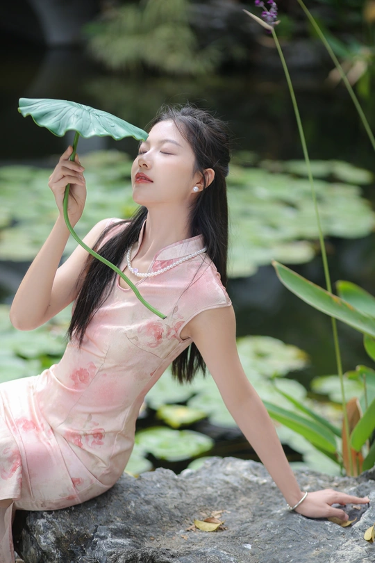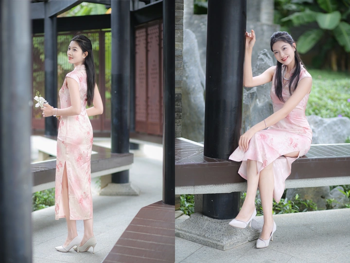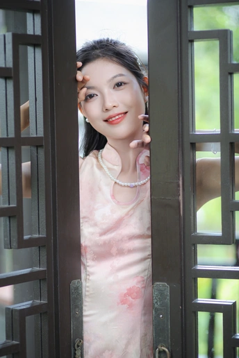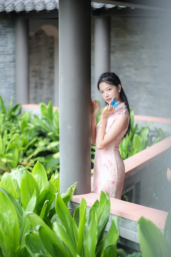 身穿优雅的粉色旗袍, 细腻的光影下尽显江南的温柔婉约, 一回眸间透着静谧雅致的东方韵味 , 每一个细节都在诉说温柔。