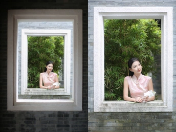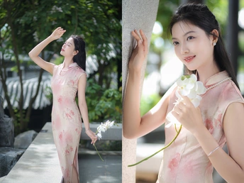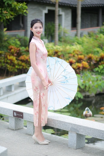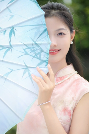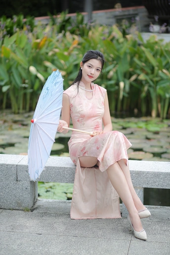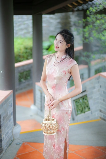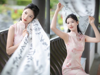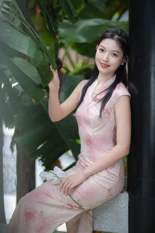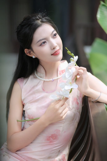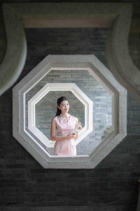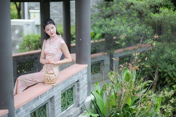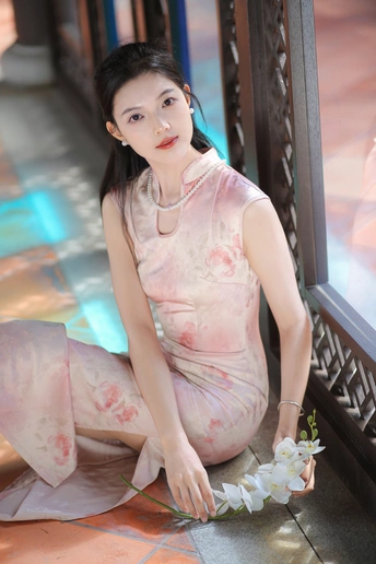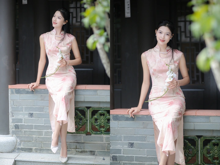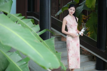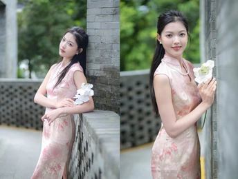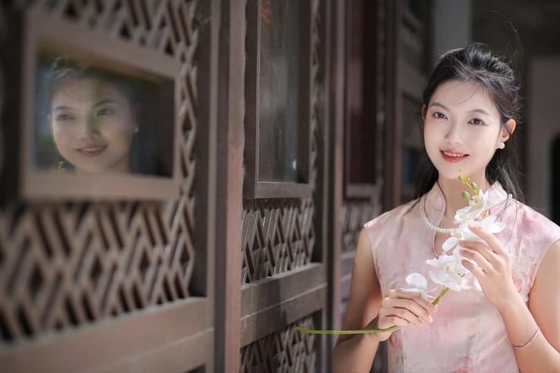 身穿优雅的粉色旗袍, 细腻的光影下尽显江南的温柔婉约, 一回眸间透着静谧雅致的东方韵味 , 每一个细节都在诉说温柔。