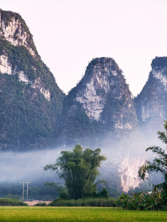 雾自山脚升起,光在远处苏醒。竹影与田色交织,一切都被柔化成梦。风轻,山静,时间在此停顿,只剩一幅安然的画。