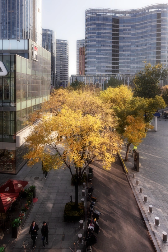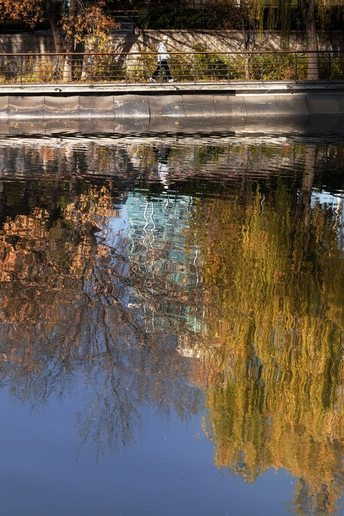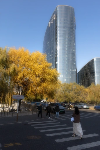 午后的阳光,像温柔的金纱,洒在河畔。水面被风揉出细碎的波纹,将岸边的秋树、远处的楼宇都晕染成流动的彩画。一位行人在步道上缓缓走过,影子与树影、楼影一同在波光里摇曳。阳光暖融融的,给这秋景镀上一层慵懒的诗意,每一缕光线都在诉说着午后的静谧与美好。