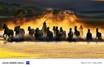 画面里,马群在水岸奔腾,橙金色的雾霭如神祇的纱幔,把草原的野性与天地的苍茫揉成了一首视觉史诗。牧马人的剪影在尘雾里若隐若现,像是旷野神话的引路人,每一匹马踏碎水面的瞬间,都在书写着关于自由与力量的狂想曲。vivo X200 Ultra的镜头仿佛拥有点石成金的魔力,把平凡的水岸变成了神话的舞台,让观者的灵魂都忍不住跟着马群在鎏金的浪涛里狂奔,把那些日常的平庸都甩在风里