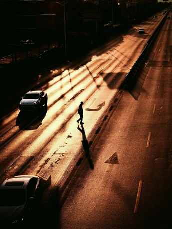 夕阳把马路浇成液态的金, 他走在光的河流里, 影子被拉得修长, 像条追逐自己的鱼。 车流是沉默的舟, 载着暮色的余温, 而他, 是这鎏金画卷里 唯一的 独行者, 把脚步 踩成了 回家的诗。