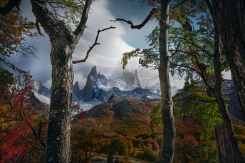 2024年4月拍摄于阿根廷巴塔哥尼亚。几株南极山毛榉如门般伫立,框住远处被云雾环绕的菲茨罗伊峰。红与金的秋林在山脚铺展,映衬着冰川的冷蓝,仿佛大地与天空之间的一次温柔对话。风穿过林梢,带走秋的气息,也留下时间的静默。