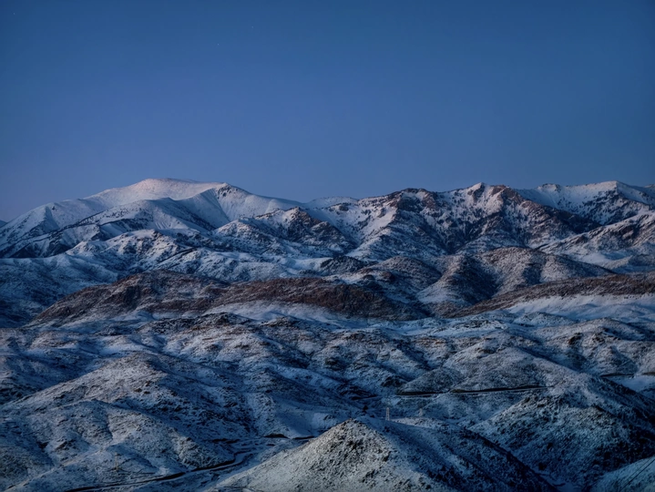夜色笼住了新疆的群山,深蓝在雪面上悄悄扩散。山体纹理被冷调轻轻勾起,宛如大地在低温中缓慢呼吸。远处的峰顶仍留着微弱的亮度,与近景的暗部形成沉稳的层次对比。画面以静制胜,安静却充满力量。