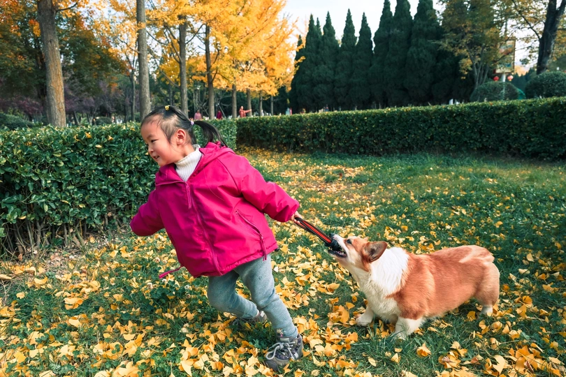 秋日光影里,小不点和柯基的“拔河大赛”