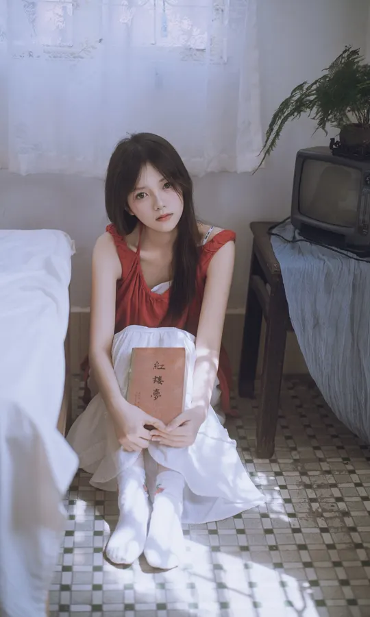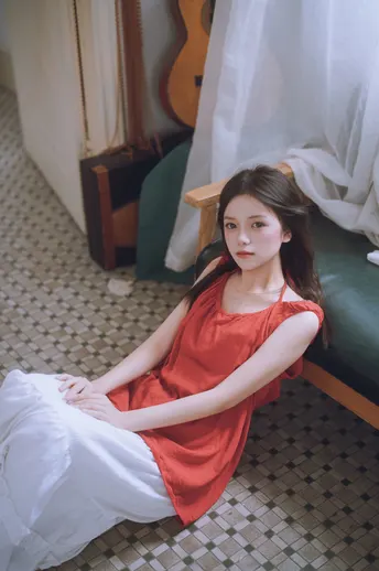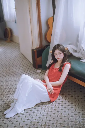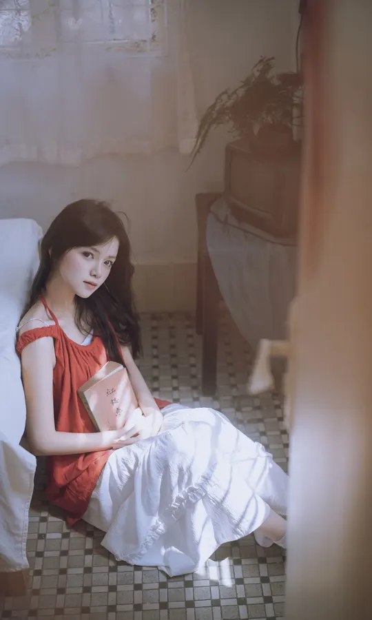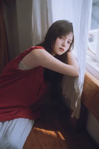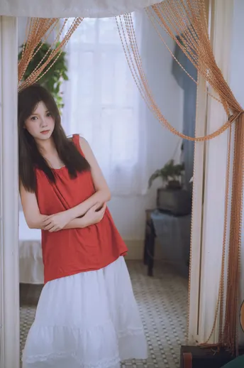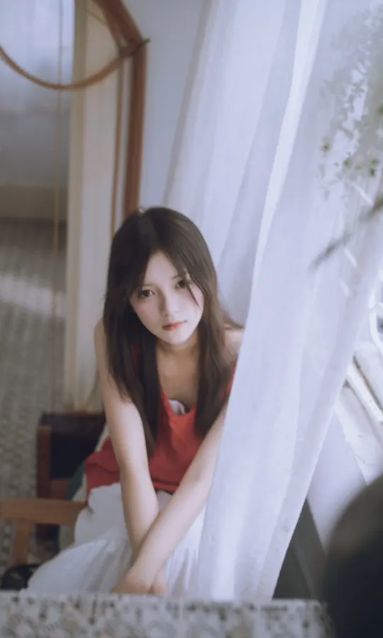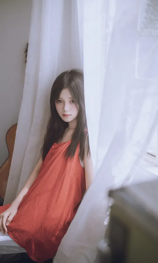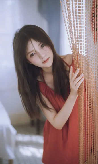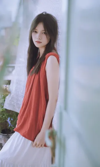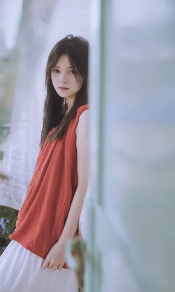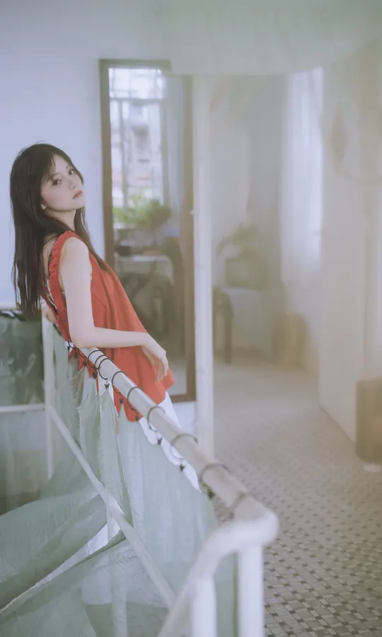 谁能拒绝夏日里的这一抹清透~站在绿意朦胧中,发丝随风,眼神温柔得像含着一汪泉水。绿色阳台门当前景,绿色门帘作背景,氛围感直接拉满!