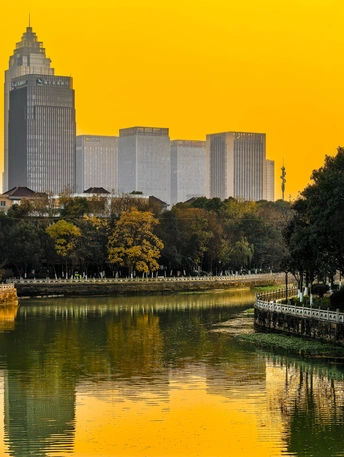 当写字楼的灯光刚点亮第一盏, 公园的水杉正把落日嚼成碎金。 鄞州公园的黄昏是块调色盘 把钢筋森林的冷,调成秋林的暖, 让每个奔波的人,都能在湖光里接住片刻温