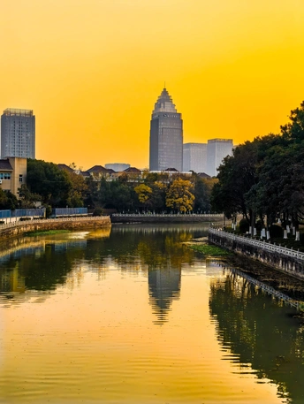 写字楼的窗刚亮起点点灯光, 秋树已把落日纺成金纱。 鄞州的黄昏是块织锦 水作经,楼作纬,秋叶是最暖的纹样, 让钢筋森林,也披上了自然的加冕