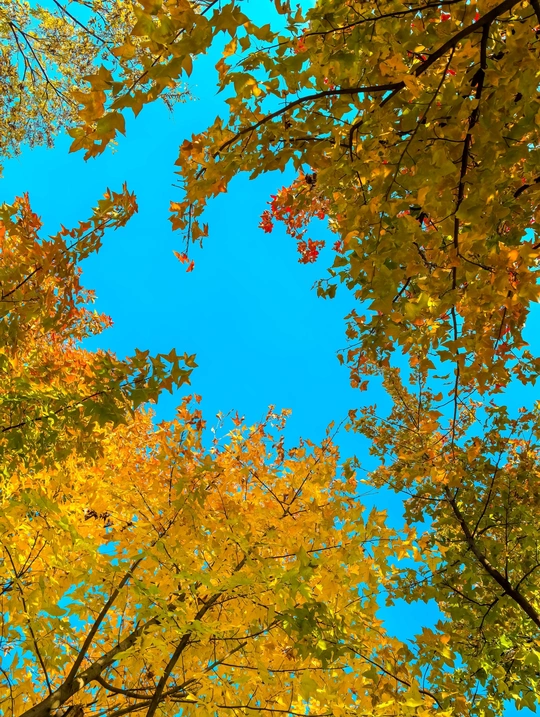 抬头时,被一整个秋天拥住 枫叶把阳光揉成碎金, 在蓝天的画布上织出穹顶。 风一吹,是星星点点的暖, 落在眼里,都是季节最热烈的告白
