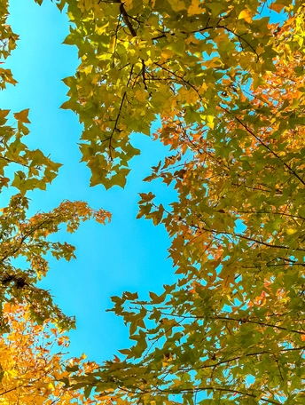 当秋叶烧作枝头的焰, 蓝天便沉成最纯粹的底色。 这是自然的乐章: 明黄是旋律,绯红是节拍, 风穿过叶隙的轻响,是秋最动听的和声