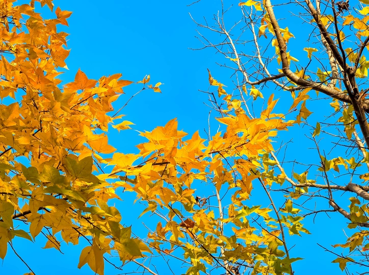 当蓝天沉作纯粹的底色, 秋叶便烧作枝头的焰。 明黄是热烈,浅绿是余温, 连疏枝的剪影都在说: 这是秋最绚烂的盛放
