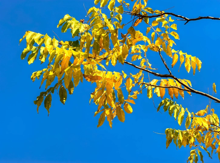叶是秋的碎金, 缀在枝梢与蓝天对谈。 浅黄是温柔,橙褐是余温, 每片晃动的光,都是季节 写在穹顶的短诗