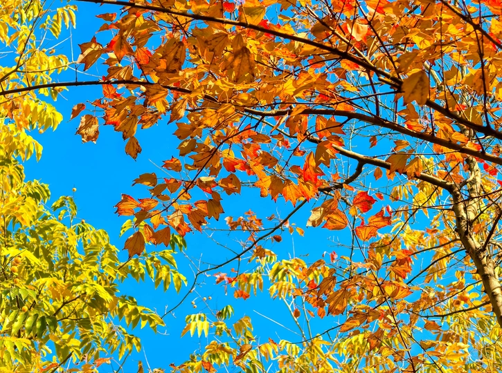 叶是秋的焰, 在蓝天的穹顶下烧得温柔。 浅黄是余温,绯红是炽烈, 连枝桠的剪影都在说: 这是季节最绚烂的盛放, 把清冷的天,都烫成了暖