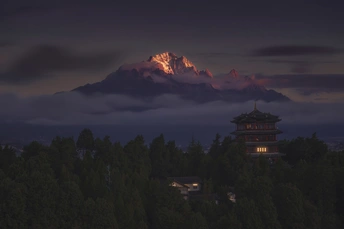 当古城还未苏醒,玉龙雪山已披上第一缕金光。 古楼的灯火与破晓的霞光温柔对话,云雾缭绕成诗。这一刻,我独享了千年茶马古道的静谧与浪漫。 2025年10月26日拍摄于丽江古城