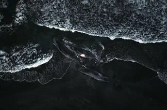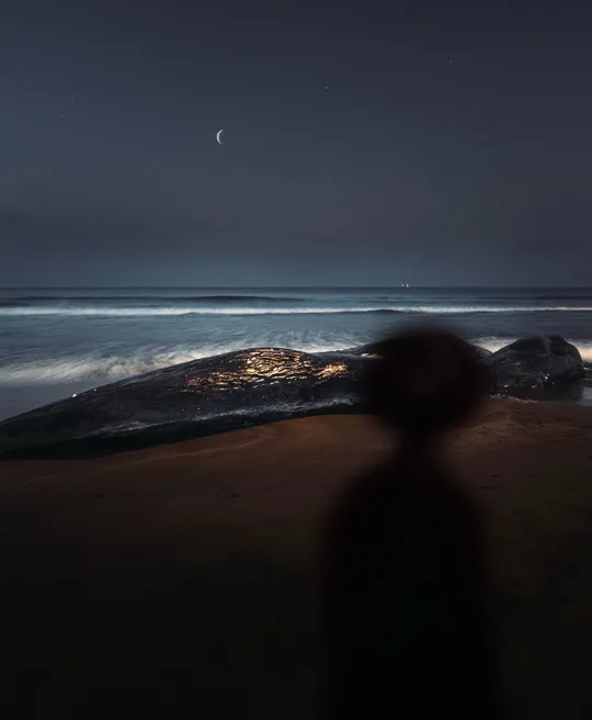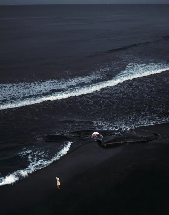 7月30号晚上,朋友在手机上给我发了一条简短的消息: “千叶的馆山发现了四头鲸鱼搁浅。” 没有多想,立刻收拾好器材,连夜出发。 抵达时,天还未亮,海岸线寂静得几乎没有呼吸声。 远远地,巨大的黑影伏在沙滩上,仿佛不是生物,而是沉默的岛屿。 风从海上吹来,咸味中带着一种难以言说的重量。 我们没有说太多话,只是各自站在镜头后, 试图用光与影去记录这场突如其来的终章—— 为大海的孩子,为无法回归的生命, 留下属于它们的最后一帧。 鲸落之岸,一次关于生命尺度的凝视