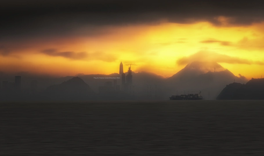 48㎞珠海-深圳平安金融中心悬日翻车,七张时间合成修出了这张照片。对了,右边那儿算帽子云吗?[发呆]