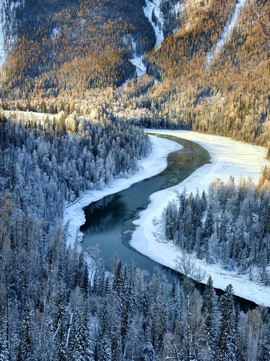 雪把山林裹成了沉默的画框,唯独这一弯水,还在轻声讲着山的故事。