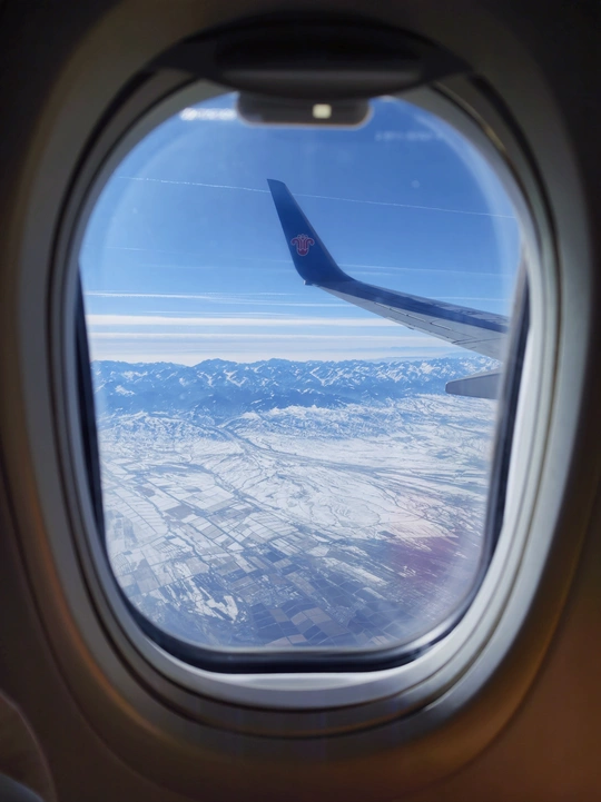 透过小小的舷窗,把雪色山河都收进眼里。机翼在蓝天下划出一道线,远处的山尖盖着蓬松的雪,像给大地铺了层安静的白。