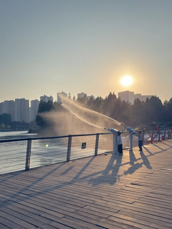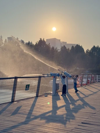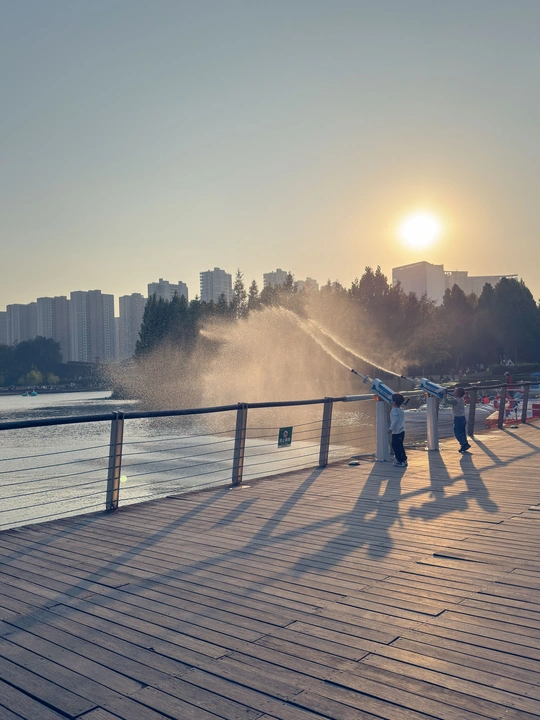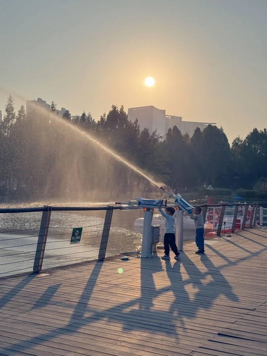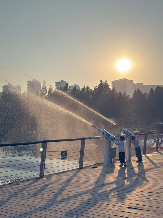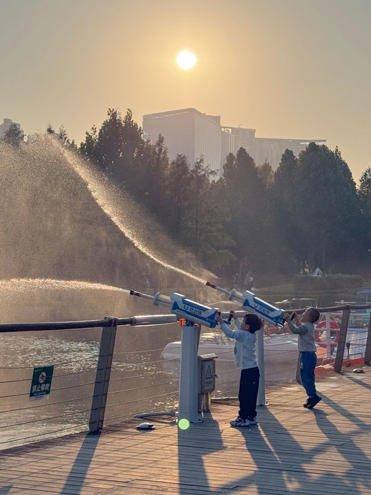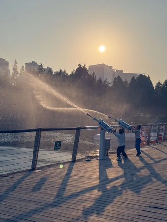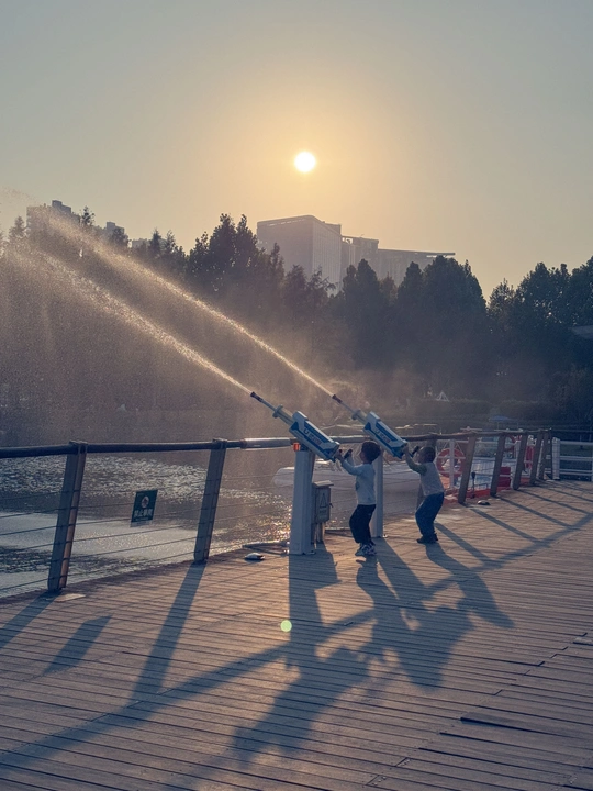 傍晚的城市公园里,夕阳顺着湖面洒下金色的光,孩子们举起水枪,对准湖面尽情“开火”,水雾在逆光中化成一条条闪着彩色光点的弧线。木栈道上被拉长的影子,像是陪他们一起奔跑的伙伴,静静记录下这份童年的勇敢与专注。没有输赢,只有笑声和水花,在此刻构成了最简单却最珍贵的快乐。