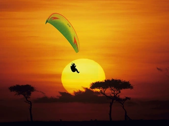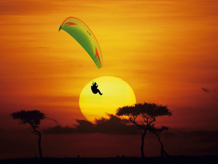 橙黄色的天空中,绿色与红色相间的滑翔伞正载着人飞行,下方是两棵剪影般的树木,整体画面充满自由与浪漫的氛围。