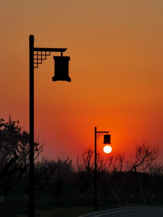 橙红色的天空中,一轮红日低垂,将天边染成温暖的色调。前景中,两盏中式灯笼灯杆矗立,灯笼罩在夕阳的光芒中形成黑色剪影,灯杆旁有光秃秃的树枝和开着粉色花朵的树木,地面上隐约可见道路的轮廓,整体氛围宁静而富有诗意。