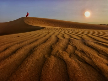 在沙坡头沙漠蹲了一整天,等日落时风突然停了,沙纹像被冻住的浪。穿红裙的姑娘是旅舍老板的女儿,她说每年此时都要来沙脊上等落日,“沙子会把去年的脚印吞掉,但光不会”。我按下快门时,她正抬手去碰天边的太阳,红裙在金浪里炸开,像把一生的热烈都揉进了沙漠的褶皱——原来有些相遇,就是让荒芜里长出火焰的。