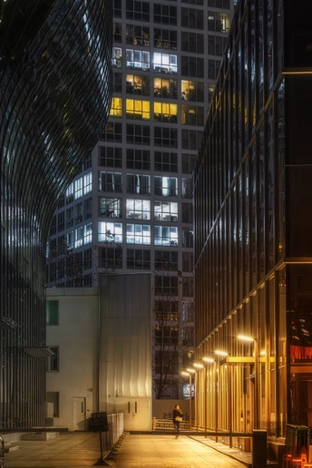 夜幕下的北京CBD文化中心,如艺术与建筑的共生体。流线型的镜面建筑与规整的楼宇交相辉映,灯光在玻璃幕墙上流转。行人在暖光步道上独行,远处楼宇的窗内似有无数故事在酝酿,这里是都市喧嚣中的文化秘境,在钢筋水泥间,书写着艺术与生活的温柔对话。