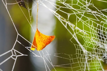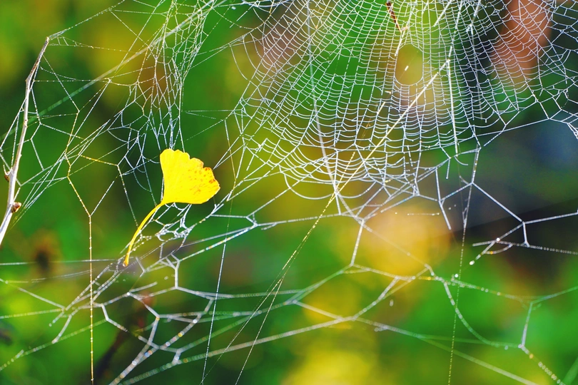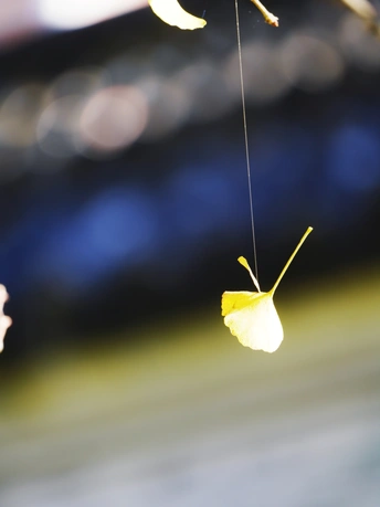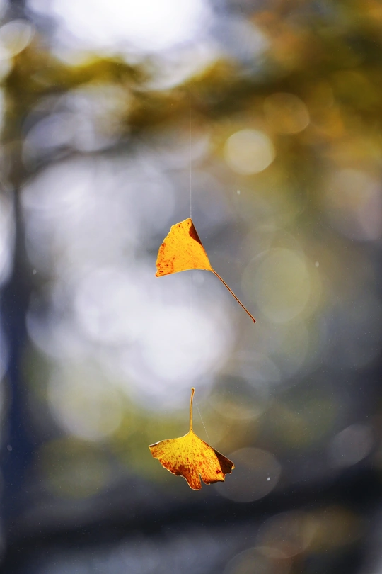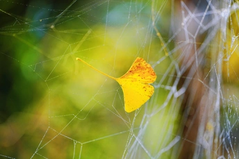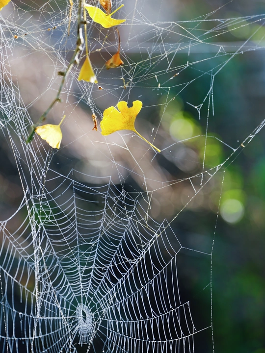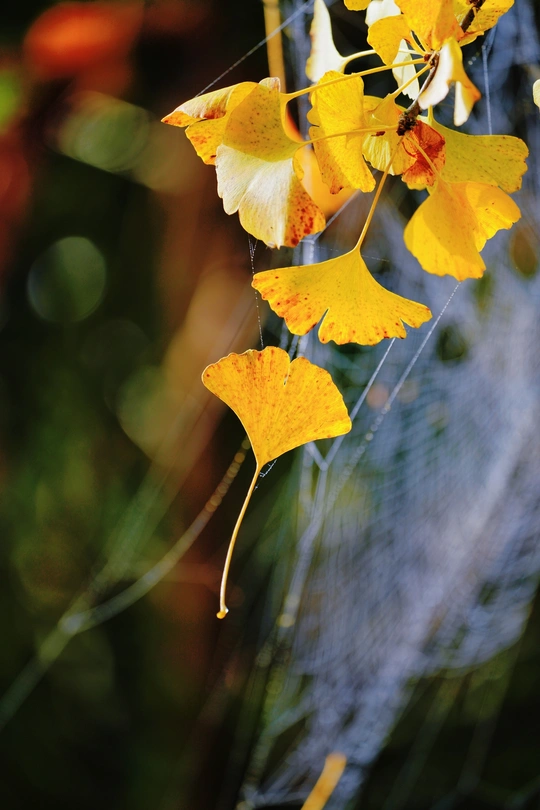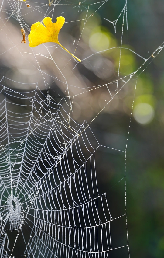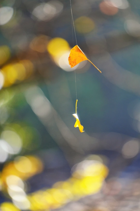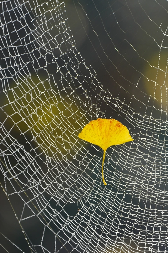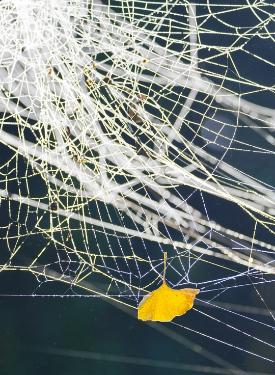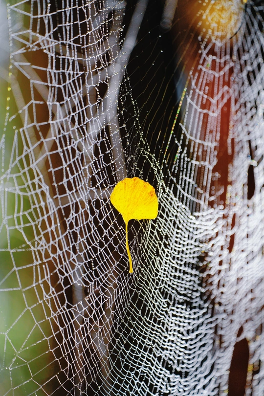 拍的银杏好象都是一种调性,如何拍出不一样的银杏!?恰好看到凋落的银杏在蛛网上,有了灵感!蛛网似乎在挽留银杏的逝去,但哪怕千织万缕也阻止不了生命的轮回! 蛛丝络秋光,银杏赴远方,时光不语,心安即家~ 银丝络秋承岁华, 金叶栖光伴露霞。 经纬千织藏暖意, 纤悬千钧系素纱。 风拂素影珠垂泪, 网印空庭碧笼遐。 暂借西风悬此际, 天涯散尽亦为家。