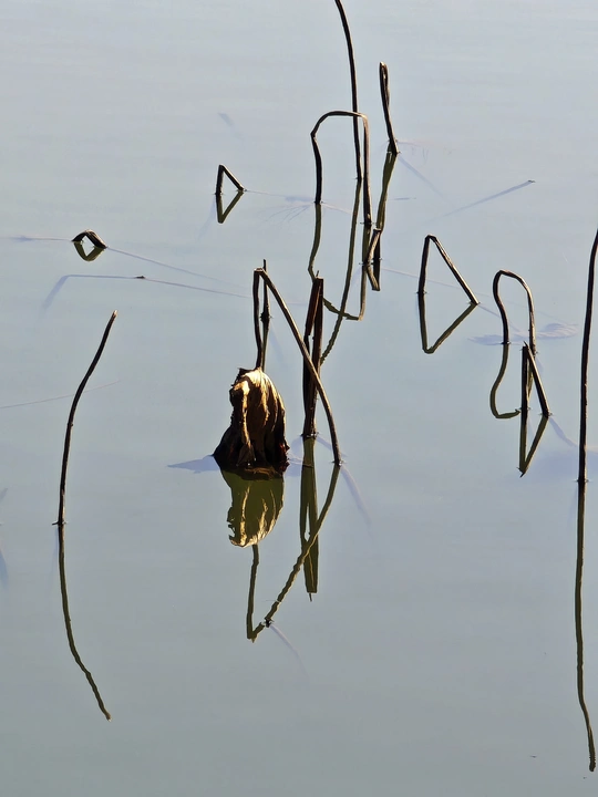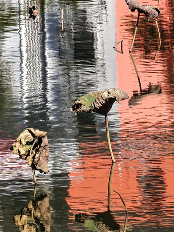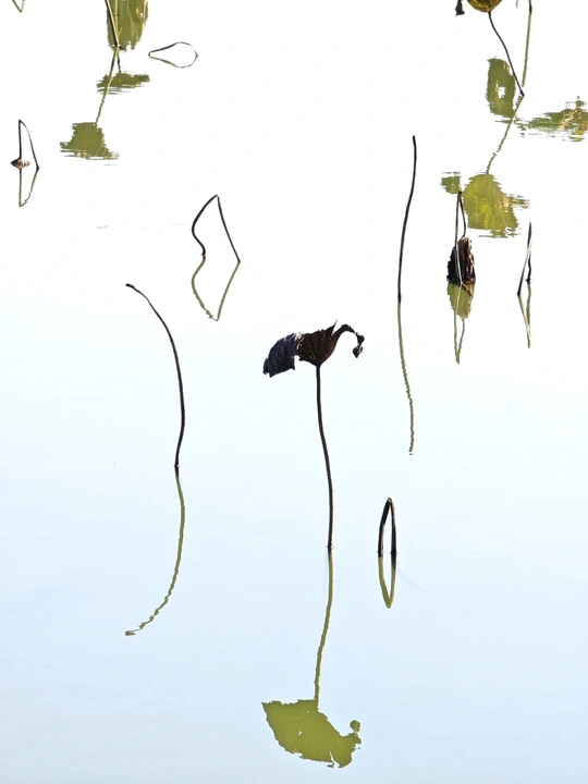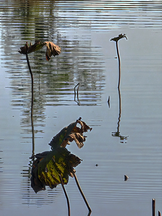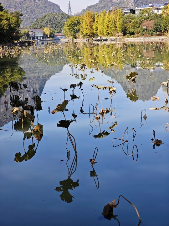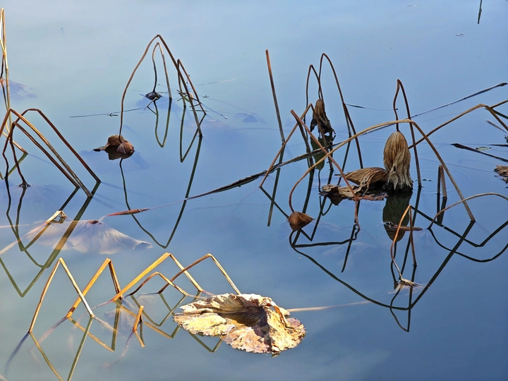 枯枝残叶在水中倒影出别样的韵味,似乎在诉说岁月′的故事。